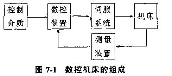 (1)數(shù)控機(jī)床的組成,數(shù)控機(jī)床一般由控制介質(zhì)、數(shù)控裝置、伺服系統(tǒng)和機(jī)床成本體組成。圖7-1的實(shí)線所示為開(kāi)環(huán)控制的數(shù)控機(jī)床框圖。