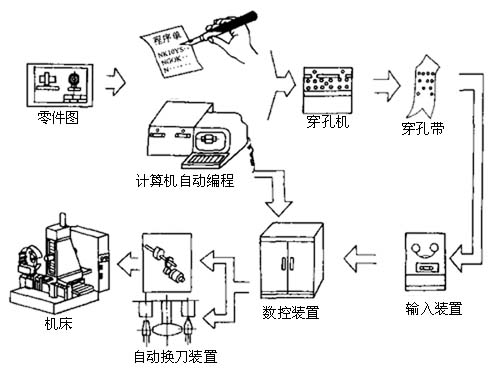 (2) 數(shù)控機(jī)床的工作原理。數(shù)控機(jī)床和加工中心的工作原理見(jiàn)圖7-2,根據(jù)零件圖樣,制訂工藝方案,編制零件的加工程序,把零件所需的機(jī)床各種動(dòng)作及全部工藝參數(shù)變成機(jī)床數(shù)控裝置能接受的信息代碼。并把這些代碼存儲(chǔ)在信息載已上(穿孔帶、磁盤等),將信息載體送到輸入裝置,讀出信息并送入數(shù)控裝置。另一種方法是利用計(jì)算機(jī)和加工中心的接口直接進(jìn)行通信輸入。