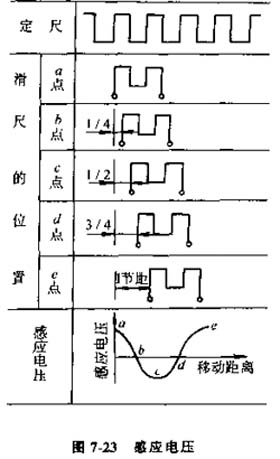 圖7-23所示為滑尺在不同位置時(shí)定尺上的感應(yīng)電壓,當(dāng)定尺與滑尺繞組重合時(shí),如圖中a點(diǎn),這時(shí)感應(yīng)電壓最大。當(dāng)滑尺相對(duì)于定尺平行移動(dòng)后,感應(yīng)電壓便逐漸減小,在錯(cuò)開1/4節(jié)距的b點(diǎn)時(shí)感應(yīng)電壓為零。再繼續(xù)移動(dòng)到1/2節(jié)距的c點(diǎn)時(shí),得到的電壓值與a點(diǎn)位置相同,但極性相反,隨后感應(yīng)電壓在3/4節(jié)距位置d點(diǎn)時(shí)又變?yōu)榱悖谝苿?dòng)一個(gè)節(jié)距到e點(diǎn)時(shí),電壓幅值與a點(diǎn)位置相同。這樣滑尺在移動(dòng)一個(gè)節(jié)距的過(guò)程中,感應(yīng)電壓變化了一個(gè)余弦波形。由此可見,在激磁繞組中加上一定的交變激磁電壓,感應(yīng)繞組中就產(chǎn)生相同頻率的感應(yīng)電壓,其幅值大小隨著滑尺移動(dòng)作余弦規(guī)律變化;咭苿(dòng)一個(gè)節(jié)距,感應(yīng)電壓變化一個(gè)周期,感應(yīng)同步器就是利用這個(gè)個(gè)感應(yīng)電壓的變化來(lái)進(jìn)行位置檢測(cè)的
