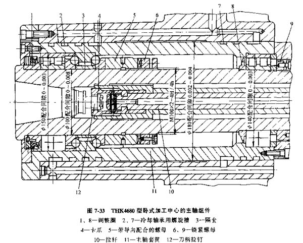 圖7-33所示為T(mén)HK4680型臥式加工中心的主軸組件,其前軸承為圓錐孔雙列圓柱滾子軸承B3182120和雙向推力角接觸球軸承C2268120,后軸承為C3182118。這些軸承均經(jīng)預(yù)緊,B3182120靠修磨調(diào)整圈1.C2268120靠修磨隔套3來(lái)調(diào)整預(yù)緊量,由帶導(dǎo)向配合的螺母5.鎖緊螺母6.壓緊;后軸承靠修磨調(diào)整圈8調(diào)整預(yù)緊量,由鎖緊螺母9壓緊。主軸套筒11與主軸箱體孔由配作保證精密配合,這種高精度、高剛度的主軸組件,其錐孔軸線的徑向圓跳動(dòng)在0.003mm以內(nèi)(主軸端部)。