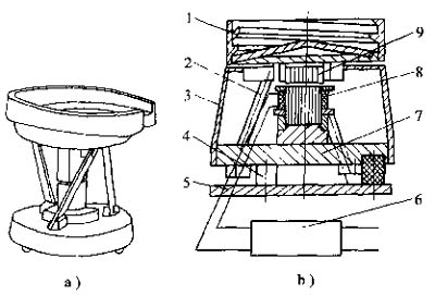 (1) 振動(dòng)式料斗的運(yùn)動(dòng)特點(diǎn)圖60-1的振動(dòng)式料斗由電磁力作為驅(qū)動(dòng)力。當(dāng)電磁達(dá)到最大值時(shí),街鐵9被吸下,帶動(dòng)料斗1,同時(shí)三片沿圓周方向分布的彈簧2變形。電磁力消失時(shí)街鐵放開,彈簧復(fù)原。彈簧的變形,復(fù)原過程中,料斗1既作上下運(yùn)動(dòng),又作扭轉(zhuǎn)運(yùn)動(dòng),使零件從低部沿螺旋軌道上升,在料斗內(nèi)座上布置的定向裝置對(duì)零件作定向整理。正確定向的零件從料斗上部的出料口進(jìn)入輸聊管道。