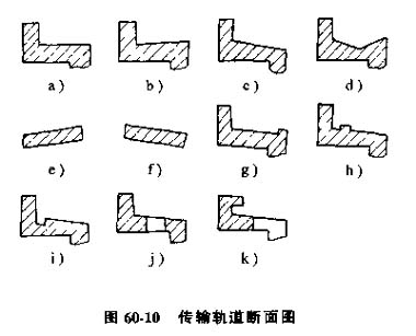 (1) 軌道斷面,圖60-10為傳輸軌道斷面的基本形狀。圖中圖60-10c為下傾斜軌道,允許零件滾落到下級軌道上,圖60-10g軌道的下端設有能擋住零件的凸臺;圖60-10h、i分別有能掛住零件的凸臺或凹槽;圖60-10j、k分別在送進方向有長的孔或槽。