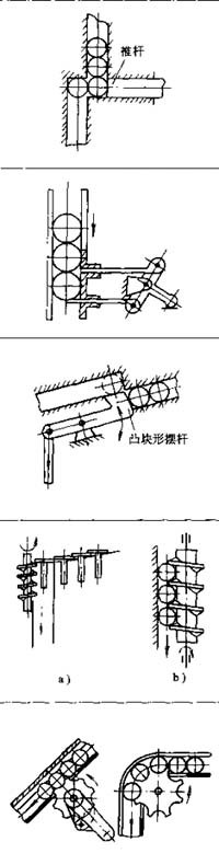 往復(fù)擺動(dòng)的凸塊形擺桿擺入時(shí)推出一個(gè)零件至待取出位置,擺出時(shí)零件落到待推位置,改變凸塊及輸料槽結(jié)構(gòu)可一次推出多個(gè)零件 |