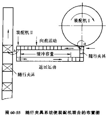 圖60-55所示為一臺(tái)回轉(zhuǎn)式裝配機(jī)與儀態(tài)直進(jìn)式裝配機(jī)的組合布置;剞D(zhuǎn)裝配機(jī)I上已裝配的組件先送到a位置的隨行夾具上。由氣動(dòng)裝置將組件從a位置腿到輸送機(jī)輸送帶上送到b位置。傳誦帶的長(zhǎng)度決定緩沖區(qū)的容量。直進(jìn)式裝配機(jī)Ⅱ上的處理裝置將組件從b位置放到裝配機(jī)Ⅱ的隨行夾具中、氣動(dòng)裝置將空隨行夾具推倒輸送系統(tǒng)的返回輸送帶上,回到a位置。