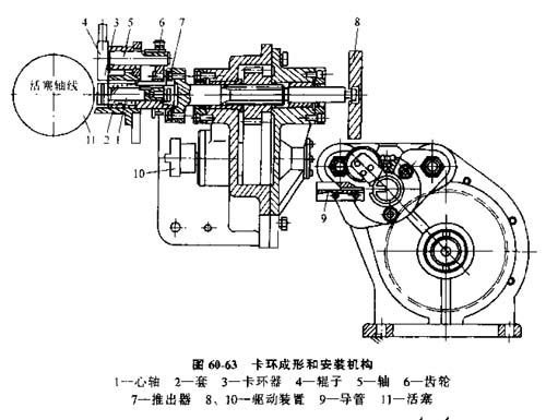 卡環(huán)的成形機(jī)構(gòu)及向活塞槽安裝卡環(huán)的機(jī)構(gòu),圖60-63所示機(jī)構(gòu)的主要元件是柱形心軸1、不轉(zhuǎn)動(dòng)的套2、推出器7和輥?zhàn)?。心軸1上開有徑向槽,可以旋轉(zhuǎn),形狀為徑向槽開始并沿其回轉(zhuǎn)進(jìn)程直徑逐漸變小的錐體。套2與心軸同軸并形成一個(gè)環(huán)形間隙,當(dāng)卡環(huán)毛坯一端被卡在心軸的徑向槽中時(shí),在環(huán)形間隙中加工出卡環(huán)的毛坯。套形推出器的外徑等于活塞上孔的直徑,安裝在環(huán)形間隙中并與心軸用鍵聯(lián)接,同時(shí)與帶軸向移動(dòng)和轉(zhuǎn)動(dòng)的驅(qū)動(dòng)裝置10和8相連。輥?zhàn)?位于把卡環(huán)3壓向心軸軸線的軸上,并通過傳動(dòng)比為1的齒輪6與心軸相連接。輥?zhàn)拥耐庑沃鸩皆龃蟆?/DIV>