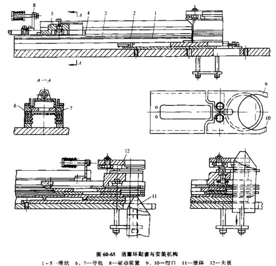 A. 在活塞槽中安裝活塞環(huán)的機(jī)構(gòu),圖60-65機(jī)構(gòu)做成盒子形狀,盒子的壁由滑塊1、2、3、4、5形成,每一個(gè)滑塊帶一套活塞環(huán)中、的一個(gè);瑝K依次安排在導(dǎo)軌6和7上。導(dǎo)軌具有斜角,可將活塞環(huán)壓在安裝基準(zhǔn)中,在起始位置上,這個(gè)些滑塊的端部構(gòu)成了一個(gè)朝向工作區(qū)的臺(tái)階,除最底下的一個(gè)滑塊外,每一個(gè)滑塊都有一塊擋鐵,作為推桿來(lái)推動(dòng)其下面的滑塊;上面的滑塊4與往復(fù)運(yùn)動(dòng)驅(qū)動(dòng)裝置8相連;瑝K的端部作成兩鉗口9和10,相互之間為彈性聯(lián)系。在導(dǎo)軌6和7上,滑塊按活塞環(huán)的給定高度配置。從專用的盒狀料倉(cāng)中通過(guò)導(dǎo)軌的縫隙拉出活塞環(huán)。當(dāng)滑塊5運(yùn)動(dòng)時(shí),由于位于滑塊4槽上的擋鐵帶動(dòng)滑塊4,類似地使滑塊3等移動(dòng)。每一滑塊確定的間隙在自己的導(dǎo)軌上移動(dòng)。接著又沿導(dǎo)軌的斜面移動(dòng),滑塊一個(gè)個(gè)地堆積起來(lái)。此時(shí),每個(gè)活塞環(huán)以自己的大部分端面支撐在踝塊張開(kāi)的爪上,并被上面滑塊壓住。