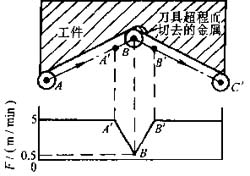 在輪廓加工中,應注意克服由于慣性或伺服系統(tǒng)的隨動誤差而造成輪廓拐角處的“超程”或“欠程”現(xiàn)象。為此,要選擇變化的進給量,即在接近拐角處應適當降低進給量,過拐角后在逐漸升高,以保證加工精度(見圖4-5)。
