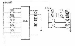 由于閥Y3帶有2個電磁鐵(4DT、5DT),且為“非”關(guān)系,如何從已占滿的PLC輸出端點中引出一控制信號來控制5DT呢(圖3)?若增加一輸出端點來控制5DT,勢必要增加輸出模塊,并要修改梯形圖,從而大大增加了改造費用。為此我們對PLC輸出點進(jìn)行了一些改動(圖4),圓滿地解決了PLC輸出點不足的問題。把PLC原來直接推動電磁鐵改為推動中間繼電器K1、K2、K3,然后由K1、K2、K3來控制電磁鐵4DT、5DT、2DT、3DT。通過K1的常開和常閉點,使4DT和5DT滿足了“非”的關(guān)系。