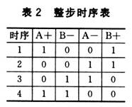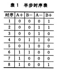 步進電機有兩種工作方式:整步方式和半步方式。以步進角1.8°四相混合式步進電機為例,在整步方式下,步進電機每接收一個脈沖,旋轉(zhuǎn)1.8°,旋轉(zhuǎn)一周,則需要2OO個脈沖。在半步方式下,步進電機每接收一個脈沖,旋轉(zhuǎn)0.9°,旋轉(zhuǎn)一周,則需要4OO個脈沖?刂撇竭M電機旋轉(zhuǎn)必須按一定時序?qū)Σ竭M電機引線輸入脈沖。以上述四相六線制電進電機為例,其半步工作方式和整步工作方式的控制時序如表1和表2所列。