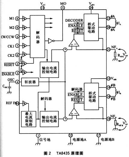 從圖2中可以看出,TA8435主要由1個解碼器、2個橋式驅(qū)動電路、2個輸出電流控制電路、2個最大電流限制電路、1個斬波器等功能模塊組成。