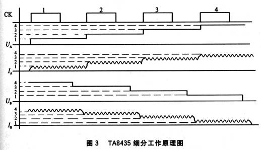 實現(xiàn)細分方式有多種方法,最常用的是脈寬調(diào)制式斬波驅(qū)動方式,大多數(shù)專用的步進電機驅(qū)動芯片都采用這種驅(qū)動方式,TA8435就是其中一種芯片。