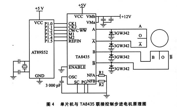 圖4是單片機與TA8435相連控制步進電機的原理圖。引腳M1和M2決定電機的轉(zhuǎn)動方式:MI=0、M2=O,電機按整步方式運轉(zhuǎn);Ml=1、M2=0,電機按半步方式運轉(zhuǎn);M1=O、M2=1,電機按1/4細分方式運轉(zhuǎn);Ml=1、M2=1,電機按l/8步細分方式運轉(zhuǎn)。CW/CWW控制電機轉(zhuǎn)動方向,CKl、CK2時鐘輸入的最大頻率不能超過5 kHz。控制時鐘的頻率,即可控制電機轉(zhuǎn)動速率。REFIN為高電平時,NFA和NFB的輸出電壓為0.8 V,REFIN為低電平時,NFA和NFB輸出電壓為0.5 V,這2個引腳控制步進電機輸入電流,電流大小與NF端外接電阻關(guān)系式為:,Io=Vref/Rnf。圖4中,設(shè)REFIN=l,選用步進電機額定電流為0.4 A,Rl、R2選用1.6 Ω、2W的大功率電阻,O、C兩線不接。步進電機按二相雙極性使用,四相按二相使用時可以提高步進電機的輸出轉(zhuǎn)矩。D1~D4快恢復(fù)二極管用來泄放繞組電流。