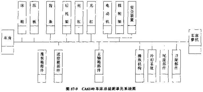 在裝配單元系統(tǒng)圖上,加注必要的工藝說明,如焊接、配鉆、攻螺紋、檢測及在裝品的移位、翻轉(zhuǎn)等,則夠成裝配工藝系統(tǒng)圖,見圖57-10。
