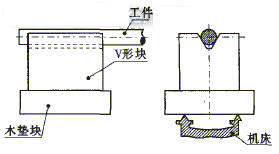 粗車時,可采用如圖1所示的支架,支架由V形塊和木墊塊組成,木墊塊壓在機(jī)床導(dǎo)軌上。