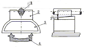 半精車、精車時可采用如圖2所示的托架,托架是在加工過程中起減振作用的主要輔具,托架由兩塊制有3°斜面的木質(zhì)(紅松)托塊組成,上托塊的上面制成V型托口,這可使工件與上托塊在互相作用時能夠形成不完全碰撞,受力時一部分功能將受到損失,以達(dá)到減小反作用力的目的。根據(jù)實(shí)踐經(jīng)驗,V型夾角α=30°~50°為宜,輔具安放數(shù)量視工件長徑比及工件長度而定,當(dāng)長徑比大于80、工件長大于1500mm以上時,每隔600~800mm放置一個。
