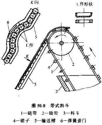 抓取法定向利用運(yùn)動(dòng)的定向機(jī)構(gòu)抓取工件的某些表面,。如孔、凹槽等,使之從成堆的雜亂工件中分離出來(lái),并定向排列。圖50-8所示的帶式料斗,適用于碗狀、蓋狀和環(huán)狀零件的自動(dòng)定向。裝有銷4的鏈帶1在連續(xù)運(yùn)動(dòng)時(shí),堆在料斗3中的工件被銷子4掛住,依次送入輸送槽5,當(dāng)槽5中料滿時(shí),銷子1仍帶工件擠入槽5,槽上彎曲部分的彈簧蓋門(mén)6被打開(kāi),多余的工件落入外料箱。