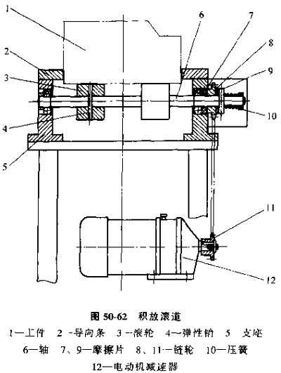 當(dāng)轉(zhuǎn)軸與鏈輪、滾輪均采用剛性聯(lián)接時(shí),傳送機(jī)屬于強(qiáng)制滾輪,即不論工件處于什么狀態(tài),在電動(dòng)機(jī)運(yùn)轉(zhuǎn)情況下,滾輪始終勻速轉(zhuǎn)動(dòng),此時(shí)如果工件被擋料器阻擋停下,滾輪與工件輸送面之間的滾動(dòng)摩擦變?yōu)榛瑒?dòng)摩擦,會加大輸送面的磨損,這時(shí)對一些材質(zhì)較軟。用已精加工面作輸送面,或?qū)斔兔婢纫蟾叩墓ぜ螂S行夾具來說是不利的,因此,現(xiàn)在多采用積放式滾子傳送機(jī),也就是滾輪與轉(zhuǎn)軸之間,或轉(zhuǎn)軸與鏈輪之間,不采用剛性聯(lián)接,而是靠摩擦傳動(dòng),見圖50-62。當(dāng)正常輸送時(shí),驅(qū)動(dòng)力通過鏈條、鏈輪、滾輪、驅(qū)動(dòng)工件,工件與滾輪間為純滾動(dòng),當(dāng)工件被擋住時(shí),滾輪與轉(zhuǎn)軸或轉(zhuǎn)軸與鏈輪之間的摩擦力小于工件與滾輪間的靜摩擦,工件與滾輪保持靜止,而滾輪與轉(zhuǎn)軸,或轉(zhuǎn)軸與鏈輪之間相對打滑,從而減少了對工件輸送面的磨損。采用滾輪與轉(zhuǎn)軸相對摩擦傳動(dòng)的方式,結(jié)構(gòu)相對簡單。但滾輪與轉(zhuǎn)軸間磨損較快,對輸送精度和維修更換不利。采用鏈輪端面摩擦方式,可以通過彈簧調(diào)整摩擦力。較少摩擦片磨損的影響。維修更換都比較方便,但軸向尺寸需要加大。