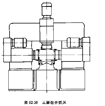 圖52-36所示為采用工件不動(dòng),銑頭進(jìn)給的兩面及三面組合銑床的配置方案。