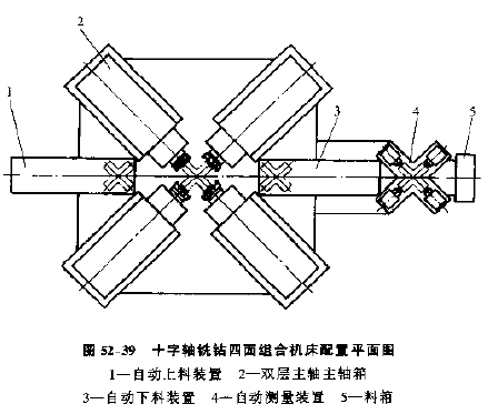 在對氣缸體。氣缸蓋、齒輪箱等箱體零件進(jìn)行平面加工時(shí),為了提高工序集中程度,可以對工件同時(shí)從兩面或三面進(jìn)行銑削,圖52-35所示為三面組合銑床的機(jī)床配置方案。