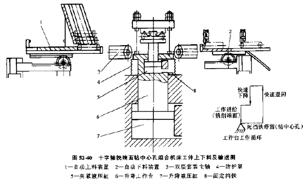 機(jī)床方案分析;由于需要的生產(chǎn)率較高,應(yīng)采用多面組合機(jī)床(見圖52-39),同時(shí)對四個(gè)軸頸加工,銑端面和鉆中心孔兩道工序可合并在一個(gè)工位上進(jìn)行。工件在輸送過程中停留實(shí)現(xiàn)銑削加工,輸送部件靠死擋鐵停留時(shí),由四面同時(shí)鉆中心孔,根據(jù)這種方案,機(jī)床主軸可以采用雙層套裝的結(jié)構(gòu)形式,外層主軸裝有套形銑刀銑十字軸端面,因主軸裝中心孔鉆頭,并用單獨(dú)的軸向進(jìn)給液壓缸進(jìn)給鉆孔。為了提高機(jī)床自動(dòng)化程度。還設(shè)有自動(dòng)上下料裝置(見圖52-40)。工件裝入傾斜料倉內(nèi),由推料托盤送入垂直移動(dòng)的輸送臺(tái)臺(tái)面上。由液壓缸把工件頂起向上夾緊,夾具定位板由兩根支柱支承,定位面朝下,可避免定位面上積屑。工件夾緊后垂直向下快進(jìn),轉(zhuǎn)為工作進(jìn)給后進(jìn)行銑削,靠固定擋鐵停留時(shí)進(jìn)行鉆中心孔,然后快退到原始位置停止,完成全部加工,機(jī)床還設(shè)有自動(dòng)檢查所銑端面距離及中心孔深度上下限尺寸的裝置,并給出合格與否的信號。合格工件自動(dòng)滑入料箱,實(shí)現(xiàn)加工的全部自動(dòng)化。
