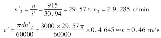 查表A1,選取MQ滿足不等式Mjmax≤MQ≤Mmax的型號,選取YZX132M242,其MQ=2903 N·m電機(jī)轉(zhuǎn)速n=915r/min,實(shí)際傳動(dòng)比i′=30.94(表A2)。