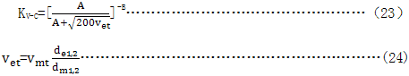 由曲線6~9與精密齒輪傳動(7.7.4.2)選擇KV-C 是基于傳動誤差(見7.4)基礎(chǔ)之上的。如果不能獲得傳動誤差,則評價齒面上的接觸斑點也是合理的。如果每側(cè)齒面的接觸斑點不一致,則齒距精度(齒距偏差)作為精度的代表數(shù)值,以確定動載系數(shù)。C是精度等級系數(shù),按GB/T10095.1給出的計算式計算。