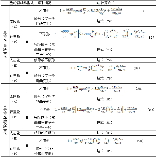 符合項(xiàng)a)中條件的行星傳動(dòng)中的各齒輪副:太陽輪(S)/行星輪(P)、內(nèi)齒輪(H)/行星輪,其KHβ可按表13中的公式計(jì)算。計(jì)算時(shí)應(yīng)取