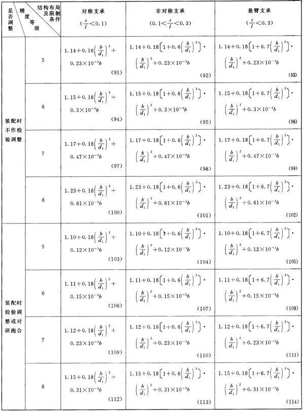 由于影響因素眾多,確切的載荷分布系數(shù)應(yīng)通過實(shí)際的精密測量和全面分析已知的各影響因素的量值綜合確定。這時(shí),要論證應(yīng)用方法的精確度和可靠性,并明確其前提條件。這種方法特別適用于調(diào)質(zhì)小齒輪寬徑比b/d>1.5或硬齒面小齒輪b/d>1.2的重要齒輪裝置的校核計(jì)算。