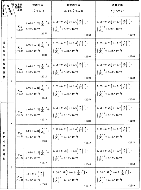 齒輪第Ⅲ公差組精度為5~8級(jí)(硬齒面為5~6級(jí))及相應(yīng)的結(jié)構(gòu)布局限制條件的KHβ簡化計(jì)算公式見表14或表15。