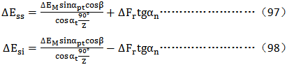 對(duì)量柱測(cè)量齒距(M值)偏差的測(cè)量結(jié)果ΔEM應(yīng)用設(shè)計(jì)圖樣規(guī)定的量柱測(cè)量距極限偏差EMs、EMi對(duì)其進(jìn)行評(píng)定。當(dāng)設(shè)計(jì)圖樣未作規(guī)定時(shí),應(yīng)將圖樣規(guī)定的齒厚極限偏差Ess、Esi按公試(91)、(92),(93),(94)換算為EMs、EMi;也可以將測(cè)得的ΔEM按公試(95),(96)(97),(98)換算為ΔEss、ΔEsi,用Ess、Esi對(duì)其進(jìn)行評(píng)定。