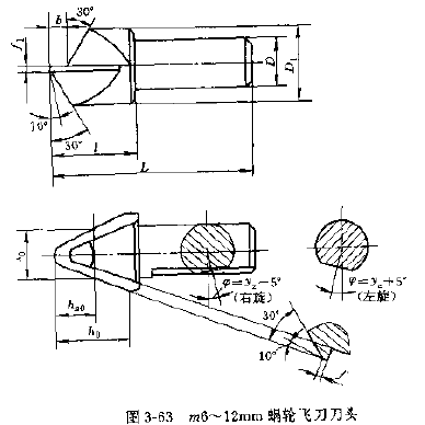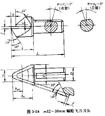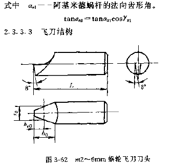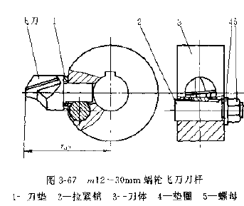 1.刀頭,飛刀刀頭一般作成圓柄狀,其前刃面通過(guò)柄部圓柱的軸線,根據(jù)被加工蝸輪模數(shù)的大小,刀頭一般分為三種,模數(shù)2~6、6~12、12~30的份刀圖3-62~圖3-64。后兩種飛刀頭由拉緊銷的斜面拉緊在飛刀刀桿上,飛刀刀柄平面與飛刀前面的夾角為 ,其值為: