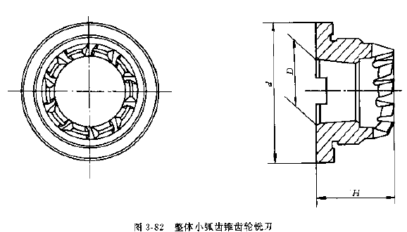 小弧齒錐齒輪銑刀用于加工小弧齒錐齒輪副中的大、小齒輪。該銑刀是雙面銑刀,外和內(nèi)刀齒各占刀齒數(shù)的一般,公稱直徑有0.5,1.1,1.3,1.5,2.0in等五種,其結(jié)構(gòu)型式和基本尺寸見圖3-82和表3-169~表3-170。