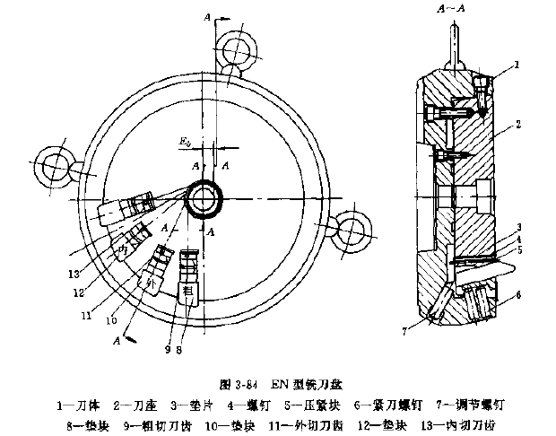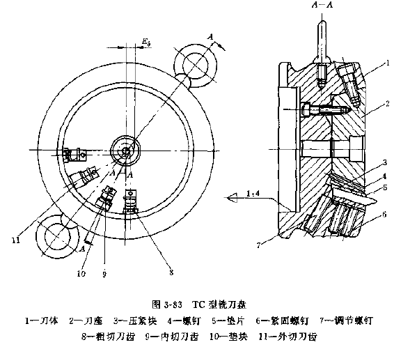 標(biāo)準(zhǔn)刀盤適用于成批和大量生產(chǎn)。較舊的標(biāo)準(zhǔn)刀盤是TC型刀盤,其公稱切線半徑39~125mm,用來切削法向摩樹2.1~8.5mm、外錐距55~250mm。當(dāng)量齒數(shù)24~75的普通延伸外擺線齒錐齒輪和小偏位的準(zhǔn)雙曲面齒輪。著種刀盤的結(jié)構(gòu)型式見圖3-83。TC型銑刀盤有不少缺點(diǎn),已被結(jié)構(gòu)較新的EN型銑刀盤和其他刀盤所代替。