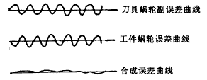 2. 周期誤差抵消,如果測(cè)出插齒機(jī)兩套蝸輪副的周期誤差(即蝸桿誤差)大,而兩套蝸輪的齒數(shù)zfc和zf又不相同,這時(shí)可選定z/zc=zf/zfc,使得兩套蝸桿的周期變得相同,再配合儀器調(diào)整其相位相反后固定。這樣,在以后的運(yùn)動(dòng)過(guò)程中蝸輪副的周期誤差值將被抵消絕大部分(圖4)。
