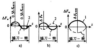插齒時(shí),有三個(gè)基本因素對(duì)產(chǎn)生△Fw值是有影響的,首先就是機(jī)床分度蝸輪副的運(yùn)動(dòng)誤差(運(yùn)動(dòng)偏心),由于分度蝸輪副運(yùn)動(dòng)偏心所產(chǎn)生的公法線長(zhǎng)度變動(dòng)量是正弦曲線時(shí),每個(gè)分度蝸輪副的誤差相加后得出公法線長(zhǎng)度的總誤差,其值不僅與分度蝸輪副的原始誤差有關(guān),而且與正弦曲線的相位移有關(guān),同時(shí)也與插齒刀與工件齒數(shù)間的比例關(guān)系有關(guān)。如果插齒刀與工件齒數(shù)相等或成整數(shù)倍的話,那么在正弦曲線方向相同的條件下,總誤差Fw將減小(圖1a)。當(dāng)正弦曲線方向不同時(shí),根據(jù)不同的相位距Fw值或可能沒(méi)有變化 (圖1b)或達(dá)到最大值(圖1c)。因此可以說(shuō),甚至在插削相同工件時(shí),也可能產(chǎn)生不同的原始誤差總值。