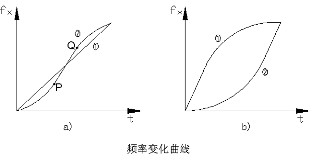 如a中的②圖所示,在頻率輸出過(guò)程中,頻率與時(shí)間的關(guān)系呈“S”形,即:在剛起動(dòng)時(shí),頻率的變化比較慢(0-P段),然后頻率又和時(shí)間成線(xiàn)性變化,在Q點(diǎn)以后,頻率的變化又降了下來(lái)。此種方式適合于帶式輸送機(jī)一類(lèi)的負(fù)載。