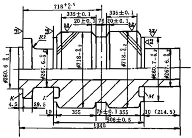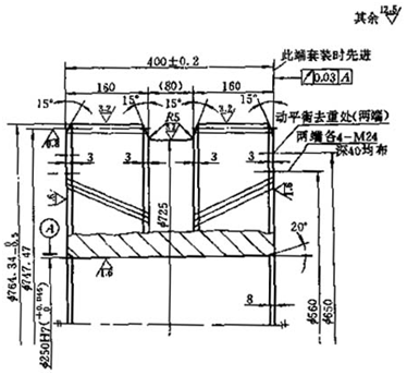 工作調(diào)面校內(nèi)孔,端面圓跳動(dòng)≤0.02mm。車去φ720mm臺(tái)階,保持工件總厚400+0.2 +0.1mm,孔口倒角8×20°,端面打印原標(biāo)記 |