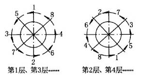 2 焊前準(zhǔn)備 (1)焊前轉(zhuǎn)軸表面應(yīng)仔細(xì)清理,嚴(yán)格清除一切會(huì)產(chǎn)生氫氣的油類等雜質(zhì)! (2)選用J857 焊條,φ3. 2mm。焊前將焊條在爐中250~300℃烘干2h,隨用隨取,消除焊條中的水分! (3)在直流電焊機(jī)上采用反接法。3 焊補(bǔ)工藝 (1)將整個(gè)轉(zhuǎn)軸放進(jìn)烘爐預(yù)熱到300℃后取出! (2)將轉(zhuǎn)軸吊到滾輪支架上,滾輪應(yīng)支承于軸上φ135及φ140兩外圓處,裝上扳轉(zhuǎn)卡箍! (3)采用對(duì)稱交錯(cuò)焊補(bǔ),每圈分8段,每層接頭收尾均應(yīng)錯(cuò)開, 填滿弧坑, 電流值取90A~100A,慢焊速,以防止轉(zhuǎn)軸過熱,減小熔深和熱影響區(qū)。采用連續(xù)施焊,焊縫寬度應(yīng)大于6mm,高出轉(zhuǎn)軸表面2mm,第1層和第2層的焊接次序見圖2所示,第3層次序與第1層相同,第4層與第2層相同,其余類推。