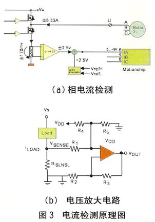 電流檢測 電機電流檢測電路可提供重要的反饋信息,將該信息與來自主控DSP的控制信號相結合,可以控制MOSFET或IGBT的柵極驅動芯片并最終調整電機速度。如果要實現(xiàn)過流保護,還必需進行電流監(jiān)控,不過對于低端應用而言,傳統(tǒng)的過流保護卻顯得過于昂貴。電流采樣的方案是在逆變橋的下橋臂串一0.027Ω采樣電阻如圖3(a),采樣電流范圍為0~6.22A,采樣后的電壓放大倍數(shù)為14.63倍,放大電路如圖3(b),并經(jīng)2.5V電壓抬升輸入DSP,所以輸入DSP的電流模擬電壓量為: UAD=2.5+I×0.027×14.63。 MotionChip AD口的模擬量輸入電壓為0~5V,所以電流采樣經(jīng)量化的值為: