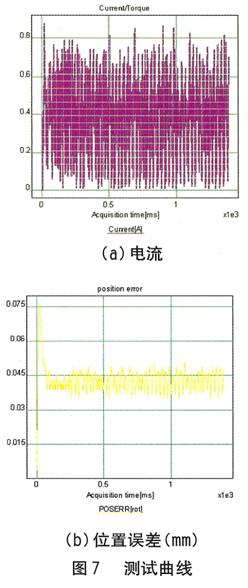 用戶操作界面功能有: •參數(shù)設置與顯示模塊主要是設置一些系統(tǒng)參數(shù)(如掃查長度,探測寬度)和控制參數(shù)(如速度參數(shù)、加速度參數(shù)等); •任何時刻,控制程序都時刻監(jiān)視系統(tǒng)的運行狀況,隨時對系統(tǒng)故障做出相應的處理。 軟件部分包括X向運動和Y向的掃查運動,數(shù)據(jù)存儲及處理,手動控制,故障處理,運動狀態(tài)顯示及故障顯示等。操作界面(GUI)給予清晰、簡單的用戶界面,方便用戶調試、運行,同時能夠將伺服驅動器傳遞過來的信息顯示出來,便于監(jiān)控。任務編程模塊將要實現(xiàn)控制任務的規(guī)劃,如X軸向和Y軸向運動等,包括故障查詢、處理。 運行效果 智能伺服驅動器性能的好壞直接決定整個系統(tǒng)設計的成敗,為此用一直流電機對驅動器進行測試,電機的電流和位置誤差如圖7(a)、(b)所示,從圖7中可以看出,驅動器的響應時間只有0.12s,位置誤差很小。通過對通訊速度及上位機控制命令的測試顯示,在實時性要求不是非常嚴格的情況下,以RS232串口或者485串口的通訊速率是完全可以滿足系統(tǒng)需求的。