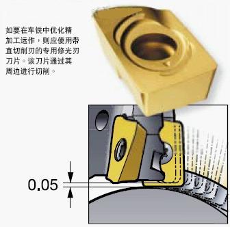 就粗加工工序而言,車銑不需要專用刀具;但若要優(yōu)化精加工工序,則應(yīng)使用專用的標(biāo)準(zhǔn)修光刃可轉(zhuǎn)位刀片。要使輕微的表面形狀偏差變圓滑,需要使用直的修光刃刀刃,而非用于一般銑削的常規(guī)弧形刀刃。在車銑運(yùn)動中,切削點(diǎn)沿著生成表面的切削刃前后移動,而這意味著弧形刀刃可在直徑上造成更多的高度變化,從而加大扇形深度。