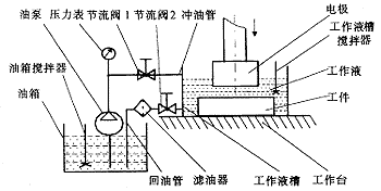混粉鏡面電火花加工是近年來(lái)發(fā)展起來(lái)的一種改善大面積電火花加工表面粗糙度的先進(jìn)技術(shù),所謂混料鏡面電火花加工即是在工作液中添加了微粉,譬如,硅粉、鋁粉、鉻粉,以及有關(guān)添加劑,以期使加工表面獲得鏡面效果。日本最早進(jìn)行了研究,并取得了較好的效果。國(guó)內(nèi)起步較晚,哈爾濱工業(yè)大學(xué)特種加工所近來(lái)也進(jìn)行了這一領(lǐng)域的研究。由于在工作液中混入了微粉,因此不能用電火花機(jī)床原有的工作液循環(huán)裝置。我們?cè)谇捌诘脑囼?yàn)中應(yīng)用簡(jiǎn)易工作液循環(huán)裝置發(fā)現(xiàn)存在如下問(wèn)題:(1)加工中混在工作液中的粉末有較嚴(yán)重的沉積的現(xiàn)象,影響了電極與工件的正常放電;(2)粉末在工作液中分布的均勻性也不理想,影響了放電的分散性,不利于提高工件的表面粗糙度;(3)沖油控制不便。因此需要重新設(shè)計(jì)工作液循環(huán)裝置。