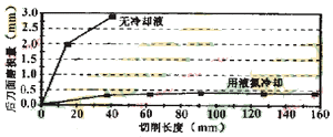 在車刀前刀面上倒裝了個金屬帽狀物,其內腔與刀片的上表面共同組成一個密閉室。帽狀物上有液氮的入口和出口。在干切削過程中,液氮不斷在密閉室中流動,吸收刀片上的切削熱,使刀具不產(chǎn)生過高的溫升.始終保持良好的切削性能,順利實現(xiàn)干切削。圖4是用PCBN刀具加工RBSN工件材料時刀具磨損量的實驗結果。在不使用液氮冷卻刀具時PCBN刀具車削長度僅40mm,后刀面磨損量便高達3mm,切削無法再進行下去。采用上述液氮裝置后,刀具磨損情況大為改善,車削長度160mm后,后刀面僅磨損0.4mm。被加上工件的圓度誤差也從20μm減至3.2μm。液氮是一種很容易獲得的原料價格便宜還可以反復使用。