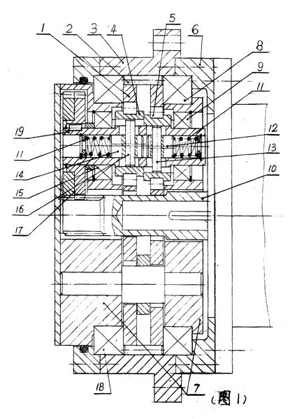 | 一種屬于曲柄擺線減速機或擺線減速機結(jié)構(gòu)形式的工業(yè)機器人微回差減速機,其特征在于: (a)輸入軸[19]內(nèi)有一通孔; (b)輸入軸[19]裝配偏心軸承[4]、[5]部位上分別加工出同旋向的二螺旋槽,每一處螺旋槽系旋轉(zhuǎn)180°對稱、同旋向二短槽,兩槽旋轉(zhuǎn)貫通,槽指向偏心軸承內(nèi)孔鍵槽; (c)輸入軸[19]內(nèi)孔有對應(yīng)于螺旋槽的二只拉桿[14]與[12],在桿的徑向分別裝配銷[16]與[13],銷的一端置于一側(cè)螺旋槽中,另一端伸出另一側(cè)螺旋槽而與偏心軸承內(nèi)孔鍵槽滑配,當拉桿移動時,拉桿隨其上的銷沿螺旋槽移動的同時并轉(zhuǎn)動,最終使二偏心軸承相對偏轉(zhuǎn)一小角; (d)拉桿[14]、[12]兩端分別有壓縮彈簧[11],彈簧初壓縮力使二偏心軸承相對偏轉(zhuǎn)一小角度而不再錯開180°。 |