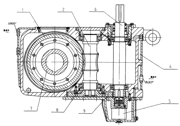 | 一種拉矯機蝸輪減速機,它是由輸入軸、軸承、斜齒輪副、蝸輪、蝸桿、密封圈、潤滑油泵、夾層水套箱體、空心輸出軸組成,其特點在于:輸入軸(6)與蝸桿(2)是立式軸,蝸輪軸為空心輸出軸(7),它是水平軸,電機為立式變頻電機,蝸輪(1)采用高強耐磨材料,空心輸出軸(7)的兩端裝有骨架橡膠密封圈(3),潤滑油泵(5)為雙向油泵,該蝸輪減速箱的動力由立式電機輸入,經輸入軸(6)下面的斜齒輪(9),將動力傳給蝸桿(2),蝸桿(2)與蝸輪(1)嚙合,由空心輸出軸(2)將動力傳給拉坯輥,軸承(8)分別裝在三根軸的兩端,固定在箱體上。 |