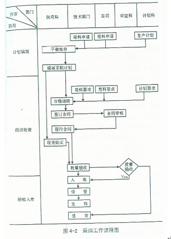 第四步競(jìng)購(gòu)。由進(jìn)入競(jìng)購(gòu)范圍的供應(yīng)單位或個(gè)人向供應(yīng)科提交申報(bào)單,載明:所競(jìng)購(gòu)物資名稱、產(chǎn)地、規(guī)格、數(shù)量、質(zhì)量、價(jià)格、交貨期、供應(yīng)渠道、售后服務(wù)等,一式兩份呈報(bào)物管辦和供應(yīng)科公開(kāi)進(jìn)行競(jìng)購(gòu)。供應(yīng)科根據(jù)生產(chǎn)供應(yīng)計(jì)劃和所掌握的最低競(jìng)價(jià),選定2~3家為供貨單位,報(bào)物管辦備查。最后由供應(yīng)科與供貨單位簽訂合同,具體實(shí)施物資采購(gòu)進(jìn)廠。 競(jìng)購(gòu)成功并簽訂合同的供貨單位須按合同要求,及時(shí)、保質(zhì)保量地供貨。若中途違約或物資使用過(guò)程中發(fā)現(xiàn)內(nèi)在質(zhì)量問(wèn)題而造成損失、影響生產(chǎn),則按規(guī)定承擔(dān)違約責(zé)任。凡違約或質(zhì)量問(wèn)題影響生產(chǎn)兩次以上者,一律取消其競(jìng)購(gòu)資格。 全程監(jiān)控 為明確各方面責(zé)任,公司從提出用料申請(qǐng)、編制物資采購(gòu)計(jì)劃開(kāi)始,到驗(yàn)收入庫(kù)、生產(chǎn)使用為止,制定了詳細(xì)的業(yè)務(wù)流程,所有環(huán)節(jié)一律按工作程序進(jìn)行全程管理。詳見(jiàn)圖4—2采購(gòu)工作流程圖。 成本管理科將上述流程活動(dòng)中所涉及的各類(lèi)信息資料如原輔材料的價(jià)格、質(zhì)量、數(shù)量、供貨單位及聯(lián)系人、責(zé)任人等輸入微機(jī),隨時(shí)進(jìn)行查詢、分析、全程追蹤監(jiān)控。