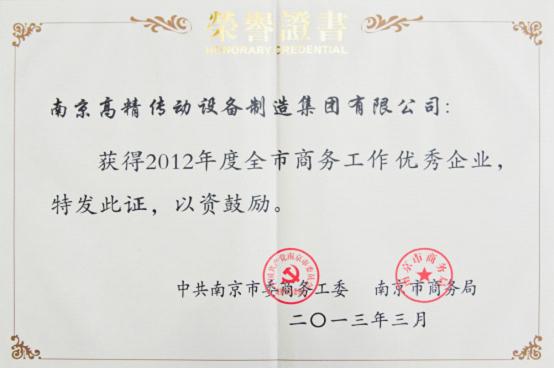 2013年3月15日,南京市政府在市級機(jī)關(guān)大禮堂召開全市商務(wù)工作會議,全面總結(jié)2012年全市商務(wù)工作,部署2013年商務(wù)工作目標(biāo)任務(wù)。南京高精傳動設(shè)備制造集團(tuán)有限公司(以下簡稱:南高齒)因成績突出被授予2012年度全市商貿(mào)工作優(yōu)秀企業(yè)稱號。