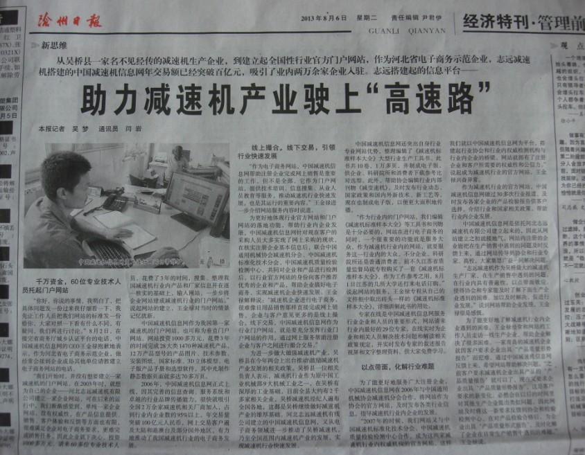 8月2日,滄州日報記者吳夢在吳橋縣宣傳部閆巖的陪同下,對減速機信息網(wǎng)進行了深入的采訪。8月6號,滄州日報刊登了財經(jīng)專題報道“助力減速機產(chǎn)業(yè)駛上高速路”。以下是報道全文: