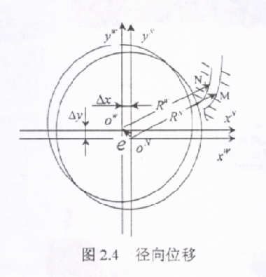 當(dāng)齒輪聯(lián)軸器內(nèi)外齒軸線發(fā)生徑向位移Δx,Δy時,內(nèi)外齒之間相對位置及嚙合狀態(tài)與零齒差內(nèi)外齒輪傳動相似,即嚙合線沿相對位移e的方向,嚙合角為90°。如圖2.4所示:設(shè)內(nèi)齒輪為主動輪由于只有徑向位移且外齒為鼓形齒,所以內(nèi)外齒在齒寬中央截面處齒廓上嚙合,設(shè)ON-XNYN固結(jié)在內(nèi)齒輪上,其上一點M(xN,yN),Ow-XwYw固結(jié)外齒輪坐標其上一點為N(xw,yw)