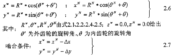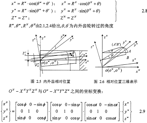 Δψ是繞YW,XW軸相對傾斜角。內(nèi)外齒輪分別經(jīng)ZN,ZW為軸線進行旋轉(zhuǎn),其轉(zhuǎn)角分別為θ,θ′,由2.1,2.4式可以確定內(nèi)外齒各齒面的極坐標,則內(nèi)外齒齒廓在直角坐標系中ON-XNYNZN,OW-XWYWZW的坐標分別為: